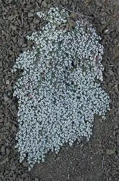 Esta es una hierba perenne que forman un grupo o alfombra, a veces un poco vertical. Las hojas son de un centímetro de largo. Son redondas u ovales y en forma triangular, tiene estípulas en las bases. Lo que parece una sola flor es en realidad una inflorescencia llamada ciatio de muchas flores masculinas en torno a una única flor central femenina. Las brácteas que rodean la unidad de flores son de color blanco y similares. El fruto es una cápsula delgada esférica inferior a 2 milímetros de ancho con una capa de semillas.