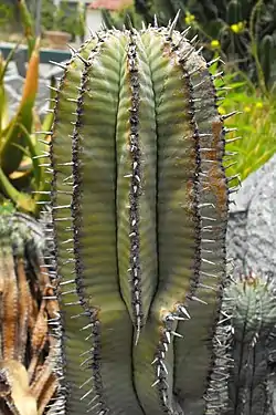 Es una planta dioica, con tallos simples o poco ramificados en la base, tal vez varios de la misma raíz, suculentos, sin hojas, con espinas o sin espinas, erectos, de 1-2, 3-4 mm de espesor, cuando son muy jóvenes con 7 ángulos, con la edad, los ángulos cambian a 10-20, glabras, verde y ligeramente glaucas en el crecimiento de jóvenes en las plantas silvestres, no glaucas cuando se cultivan en invernadero, convirtiéndose en gris con la edad. El fruto es una cápsula con semillas largas, ovoides, 4-anguladas, lisas, de color marrón.[2]