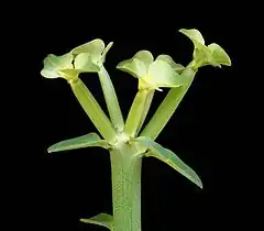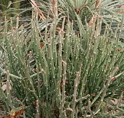 Es una planta suculenta ramificada con las inflorescencias en ciatios.