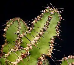 Euphorbia: nombre genérico que deriva del médico griego del rey Juba II de Mauritania (52 a 50 a. C. - 23), Euphorbus, en su honor – o en alusión a su gran vientre – ya que usaba médicamente Euphorbia resinifera. En 1753 Carlos Linneo asignó el nombre a todo el género.[5]