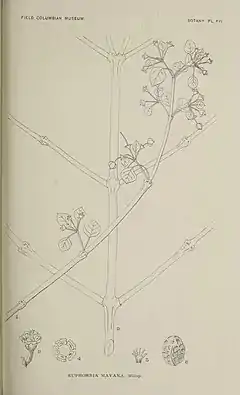 Es un arbusto o árbol pequeño, que alcanza un tamaño de hasta 5 m de alto, tallos glabros, nudos hinchados. Hojas verticiladas, ampliamente ovadas a casi orbiculares, 0.7–3 cm de largo y 0.5–2 cm de ancho, ápice redondeado a ampliamente obtuso, base redondeada a abruptamente cuspidada, márgenes enteros, membranáceas, glabras; pecíolos filiformes, hasta 3 cm de largo. Ciatio en cimas terminales y axilares, compactas, involucro glabro, brácteas verdes, glándulas 5, elípticas a suborbiculares, planas con apéndices formando un ancho margen alrededor de las glándulas, enteros o erosos, blancos. Cápsula 2–4 mm de largo, glabra; semillas ovoides, 2–4 mm de largo, tuberculadas, foveoladas, ecarunculadas.[1]