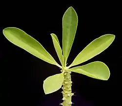 Es un árbol o arbusto laxamente ramificado que alcanza un tamaño de 3-6 (-10) m de altura, con tronco de 10 cm de diámetro, ramas carnosas, obtuso 4 de ángulo, de 1-1.5 cm de espesor, con dientes pequeños de 2-5 cm de distancia, espinoso, de hojas persistentes en los ápices de las ramas, carnosas, obovadas, 10-35 x 4-10 cm, pecíolos de 2-4 cm de largo.