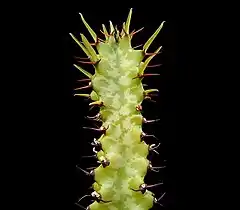 Es un árbol espinoso con tallos suculentos que alcanza un tamaño de ± 12 m de altura, con un tronco grueso, cilíndrico, a veces un poco ramificado con moderación cerca de la base, generalmente ramificado libremente por encima.