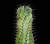 Es una suculenta de porte arbustivo que puede alcanzar 3 m de altura. El tronco principal, por lo general retorcido, permanece medio enterrado por lo que parece muy corto. A partir de él surgen tallos angulados (4 o 5 ángulos) de más de 1 m de largo y 5-6 cm de grosor. Las espinas, gruesas y de color dorado a rojo oscuro en los ejemplares jóvenes volviéndose grisáceas con el tiempo, se sitúan a lo largo de las crestas de cada ángulo, dispuestas en pares. Las flores (ciatos), que nacen en el extremo superior de los tallos, son de color amarillo. Produce frutos rojos.[1]