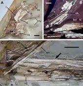 Debido al aplastamiento del cráneo, sus fragmentos, que mayormente corresponden a elementos del área alrededor de la cuenca ocular derecha, muestran pocos detalles. La mandíbula tiene una longitud preservada de veintitrés centímetros y una longitud original estimada en 255 milímetros. En su parte frontal la mandíbula presenta una fusión o sínfisis. Dicha sínfisis tiene un perfil superior cóncavo y presenta una gran cresta en la parte inferior, que apunta hacia abajo por al menos nueve centímetros. El borde posterior de la cresta es recurvada; la curvatura del borde frontal no puede ser establecida con seguridad debido al daño. La cresta es la más larga con respecto a la longitud de la mandíbula en cualquier pterosaurio conocido. La estructura interna del hueso de la cresta es esponjosa. El primer par de ceratobranquiales del hioides tienen una longitud de 135 milímetros y una sección transversal de dos milímetros.[1]