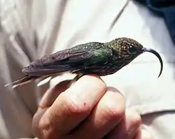 Mide 11,4 cm de longitud[4] y pesa 11 g.[5] El pico es curvo en forma de hoz, mide 25 mm de largo y tiene la mandíbula color amarillo brillante.[4] El plumaje es verde oscuro bronceado, con el borde color ante en las plumas de la grupa y de las coberteras supracaudales. La garganta y el pecho presentan listas negruzcas y amarillentas. La cola es color verde bronceado con las timoneras puntiagudas y con punta blanca. Las patas son color cuerno carnoso.[5]