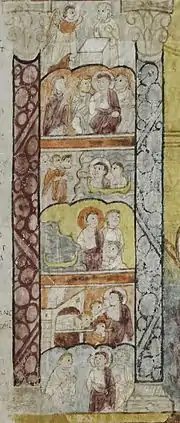 - Cristo entre los doctores (izquierda, 2º abajo, Lucas 2, 43–50) que omite a San José, probablemente por falta de espacio; María entra a la izquierda.