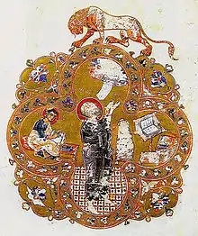 El códice de Ostromir, escrito en antiguo eslavo eclesiástico, con muchas palabras vernáculas, es famosa por sus miniaturas brillantes. El comienzo del Evangelio de Juan, con el retrato del evangelista. | ||