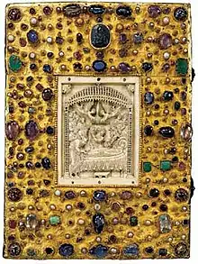 La cubierta anterior contiene un relieve bizantino en marfil con la Muerte de la Virgen María y está adornada con 188 piedras preciosas.