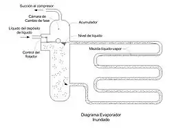 El nivel del líquido en el evaporador se mantiene más bajo o más alto mediante un control de flotador y, el vapor generado por la acción de ebullición del refrigerante en los tubos se separa del líquido en la parte superior del acumulador de donde es sacado directamente a través de la línea de succión con el vapor que se forma como consecuencia de la reducción de presión del refrigerante desde la presión de condensación hasta la presión de evaporación. Obsérvese que el gas instantáneo o flash-gas formado no interfiere en la transferencia de calor del evaporador como sucede en los evaporadores de expansión seca.