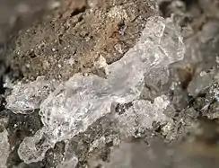 Aparece en vetas de cuarzo cortando rocas de lava vesicular. Puede encontrarse en el interior de cavidades geodas de cuarzo, soldado a éste.