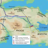 En respuesta, los focidios, bajo el liderazgo de Filomelo, se apoderaron de Delfos (que estaba situado dentro de los límites de Fócida), y afirmaron la antigua aspiración de Fócida a la presidencia de la Liga anfictiónica,[77] con la intención de anular el juicio contra ellos mismos.[78] Parece que en Grecia hubo cierta simpatía por los focidios, ya que otros estados pudieron ver que los tebanos... habían usado la Anfictionía para perseguir mezquinas y destructivas venganzas[77][79] Los focidios fueron apoyados por Atenas (enemigos perennes de Tebas) y, no es de extrañar, por Esparta, que esperaba ver su propia multa eliminada cuando los focidios se apoderaron de Delfos[80] Sin embargo, Filomelo saqueó el tesoro de Apolo para pagar los mercenarios, formando así un poderoso ejército, pero alterando drásticamente la opinión de los demás estados griegos.[81] En el invierno de 356/355 a. C., el consejo anfictiónico declaró una "guerra sagrada" contra los focidios, siendo los tebanos los principales protagonistas.[77] La guerra comenzó relativamente bien para los focidios, pero una severa derrota les fue infligida en Neón por los tebanos en 355[68] o 354 a. C.,[74] y Filomelo murió. Sin inmutarse, Onomarco ocupó su lugar al frente de los focidios, y consiguió nuevos mercenarios para continuar la lucha.[74]