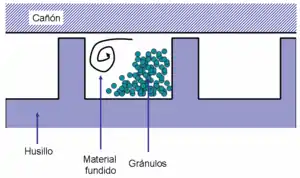 El polímero funde por acción mecánica en combinación con la elevación de su temperatura por medio de calentamiento del cañón. La acción mecánica incluye los esfuerzos de corte y el arrastre, que empuja el polímero hacia la boquilla e implica un incremento en la presión.