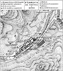 ![]() Mapa de la fábrica de armas de Trubia realizado por el ingeniero Francisco Coello de Portugal y Quesada | ||