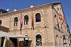 La planta principal está recorrida por cinco huecos, de iguales dimensiones, construidos por arcos de medio punto con decoración de ladrillo en el extradós y parapeto. El hastial contiene tres ventanas de arco de medio punto con extradós, también decorado, y parapeto en la ventana central. Los entrepaños de las plantas baja y principal presentan decoración de rombos realizados con ladrillo. Toda la fachada se encuentra enmarcada por dos pilastras con capitel realizado en ladrillo. Las líneas de impostas están también resaltadas con ladrillo.