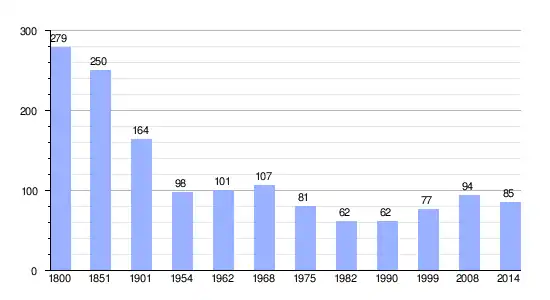 Los datos demográficos contemplados en este gráfico de la comuna de Fétigny[4] se han cogido de 1800 a 1999 de la página francesa EHESS/Cassini, y los demás datos de la página del INSEE.[5]