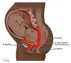 La fístula obstétrica es una condición médica por la cual se desarrolla un agujero en el canal de parto a raíz de este.[1][3] Puede localizarse entre la vagina y recto, uréter, o vejiga.[1][4] Como resultado la madre puede presentar incontinencia de orina o heces.[1] Las complicaciones pueden comprender depresión, infertilidad, y aislamiento social.[1]