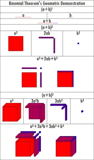 Para enteros positivos, esta demostración puede ser geometrizada:[2] si se considera la cantidad xn como el volumen del n-cubo (un hipercubo tiene n dimensiones), entonces la derivada es la modificación del volumen a medida que se cambia la longitud del lado: esto es xn−1, que puede interpretarse como el área de n caras, cada una de las dimensiones n − 1 (fijando un vértice en el origen, estas son las n caras que no tocan el vértice), que corresponde al cubo que aumenta de tamaño al crecer en la dirección de estas caras, en el caso tridimensional, sumando 3 cuadrados infinitesimalmente finos, uno por cada una de estas caras. Por el contrario, geometrizando según el teorema fundamental del cálculo, acumulando estos infinitesimales (n − 1) cubos produce una (híper)-pirámide, y n de estas pirámides forman el n -cubo, que produce la fórmula. Además, hay un n-pliegue de simetría cíclica del n-cubo alrededor de la diagonal que recorre estas pirámides (por lo que una pirámide es un dominio fundamental). En el caso del cubo (3-cubo), así es como el volumen de una pirámide se estableció originalmente rigurosamente: el cubo tiene una simetría triple, con un dominio fundamental de pirámides, dividiendo el cubo en 3 pirámides, que corresponden al hecho de que el volumen de una pirámide es un tercio de la base multiplicado por la altura. Esto ilustra geométricamente la equivalencia entre la cuadratura de la parábola y el volumen de una pirámide, que se calcularon clásicamente por diferentes medios.