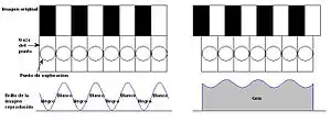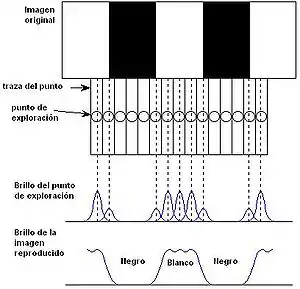 La figura 1 ilustra la combinación de los efectos debidos a la cámara y a la forma del punto de exploración del CRT y la resolución vertical de la imagen de televisión. Es evidente que cuanto mayor sea el número de líneas de exploración, mejor será la calidad de la imagen reproducida.