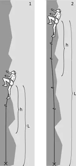 En una escalada utilizando una cuerda dinámica el factor de caída (f) es la proporción entre la altura (h) que desciende un escalador antes que la cuerda del escalador empiece a estirarse y la longitud de cuerda (L) disponible para absorber la energía de la caída.