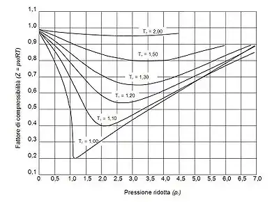 Para obtener un gráfico generalizado que pueda ser usado para muchos diferentes gases, la presión y temperatura reducidas, y , se utilizan para normalizar los datos del factor de compresibilidad. La figura mostrada es un ejemplo de un gráfico de factor de compresibilidad generalizado derivado de cientos de datos experimentales PVT de 10 gases puros, que fueron metano, etano, eteno, propano, n-butano, i-pentano, n-hexano, nitrógeno, dióxido de carbono y vapor.