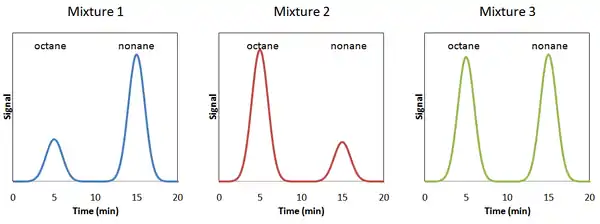 La cantidad de octano en cada muestra es diferente, pero la cantidad de nonano es la misma (en la práctica esto no es un requisito). Debido a la escala, las áreas del pico nonano parecen tener diferentes áreas, pero en realidad las áreas son idénticas. Por lo tanto, las cantidades relativas de octano en cada muestra aumentan en el orden de la mezcla 1 (menos) <mezcla 3 <mezcla 2 (más).