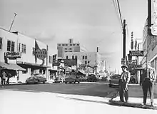 Foto tomada por Elisabeth Meyer en 1955, mirando hacia el este desde la Second Avenue y Cushman Street. El edificio ahora abandonado de Polaris, el edificio más alto en Fairbanks desde su terminación en 1952, está en el fondo.