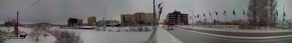 Panorama invernal de Fairbanks, desde el puente de la calle Cushman hacia el sur, con el río Chena.
