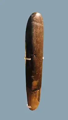 El artefacto de piedra ha sido reconstruido de catorce fragmentos, mostrando grupos de marcas y arañazos, que demuestran que también se empleó de maza. Procede de un estrato que puede distinguirse con precisión, en el que se han encontrado más de 10 000 artefactos de pedernal, numerosos restos orgánicos y gran cantidad de restos quemados de huesos. Este instrumento de percusión en forma de falo da información sobre la representación de la sexualidad masculina en el Gravetiense, en un periodo conocido principalmente por sus venus y representaciones de animales y quimeras.