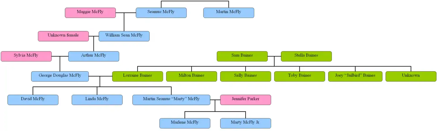 La familia de Marty McFly está compuesta por sus padres, George y Lorraine, su hermano Dave y su hermana Linda. Aunque aparecen poco en la película, los padres de George McFly tienen mención en Volver al Futuro. Jennifer Parker, la novia de Marty, aparece en las tres películas, y sus hijos Marlene y Marty Jr. aparecen en Volver al Futuro Parte II. Los tatarabuelos de Marty: Seamus y Maggie McFly aparecen en Volver al Futuro Parte III. Tienen un hijo recién nacido, William, a quien Marty llama su "bisabuelo". En otra escena, Seamus y Maggie dijeron que Seamus tenía un hermano llamado Martin McFly, que fue asesinado algún tiempo antes en un enfrentamiento.