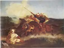 En esta misma obra invita especialmente a Delacroix, el único hombre según él que tiene la imaginación ingeniosa y el poder, la audacia y el derecho a comprender y traducir este espectáculo, a hacer lo mismo en la pintura.[93] Sin recibir respuesta de Delacroix a esta invitación, Fromentin se involucró a sí mismo en ella y presentó, en 1869, la traducción pictórica que hizo de ella en su cuadro Una fantasía: Argelia,[94] que se exhibe en el museo Sainte-Croix en Poitiers.[95]