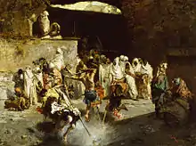La Fantasía Árabe[96] de Mariano Fortuny es una de las pinturas más originales que existen sobre el tema, en tanto no representa una clásica carga ecuestre, sino un grupo de guerreros marroquíes que llevan a cabo su espectáculo ritual a pie, inmersos en una luz cruda, dando fuerza y detalles en colores y en contornos, en dramático contraste con el fondo oscuro y sombrío.[97]