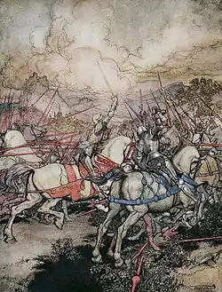 La tradición galesa ha sido particularmente influyente, que tiene su conexión con el Rey Arturo y su colección en una única obra, la épica Mabinogion. [9] Un recuento influyente de esto fue el trabajo de fantasía de Evangeline Walton: La Isla de los Poderosos, Los Hijos de Llyr, La Canción de Rhiannon y el Príncipe de Annwn . Se ha escrito una cantidad notable de ficción en el área galés de la fantasía celta; [10] otros autores notables de la fantasía celta galesa son Kenneth Morris, John Cowper Powys, Vaughan Wilkins, Lloyd Alexander, Alan Garner, [11] y Jenny Nimmo. [12]
