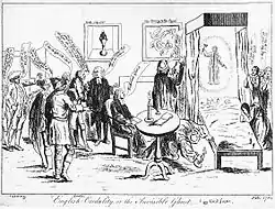 He visto la impresión de Hogarth titulada “fantasma”. Es una horrible composición de lasciva obscenidad y blasfemias que me han hecho detestar al artista y perder cualquier estima que le tenía al hombre. Lo mejor es que las peores partes de la pintura no serán entendidas por la mayoría de la gente.[54]