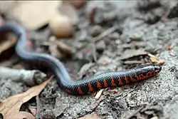 El dorso de la serpiente del barro es de color negro brillante. La parte ventral es roja y negra, y el rojo se extiende por los lados para formar barras de color rosa rojizo.