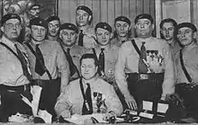 En febrero de 1934 la Falange de José Antonio se fusionó con las JONS de Onésimo Redondo y Ramiro Ledesma. El entusiasmo de este último por Hitler, su oratoria demagógica y su indudable proclividad a los procedimientos violentos convirtieron a las Juntas de Ofensiva Nacional–Sindicalista por él fundadas en el sector más radical de la Falange.[43]