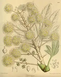 Se trata de un arbusto o pequeño árbol de hasta 5m de altura, siempreverde, con las ramitas, hojas e inflorescencias jóvenes densamente tomentoso-lanudas y, luego, glabrescentes. La hojas son simples, palmatilobadas y con estípulas soldadas al peciolo que mide 10-30 cm; tienen el limbo casi orbicular, glabro y coriáceo, de hasta 30-50 cm de diámetro, con 7-9 (usualmente 8) lóbulos estrechamente ovado-elíptico de márgenes crenado/aserrados. Las inflorescencias son panículas terminales de umbelas con anchas brácteas membranosas caducas; el eje primario tiene un 20-40 cm y los pedúnculos de 10-15 cm soportando umbelas de 3-4 cm de diámetro, con numerosas flores cortamente pediceladas. Dichas flores, hermafroditas, de color blanco-verdoso, tienen el cáliz prácticamente entero y 5 pétalos, patentes en un principio y luego reflejos, ovalados de unos 3-4 mm de largo. El androceo tiene 5 largos estambres libres erectos y el gineceo tiene el ovario penta-carpelar con 5 cortos estilos libres. El fruto es una drupa globosa mediocentimétrica, verde en un principio y negruzca brillante en la madurez, con semillas algo comprimidas lataeralmente.[1]