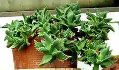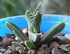 Crecen en forma de roseta sobre un corto tallo de raíces carnosas. Cada roseta está compuesta por entre 6 u 8 hojas decusadas y gruesas, casi semicilíndricas en la zona basal tendiendo a convertirse en aquilladas hacia la mitad, son de forma romboidal o entre espatulada y algo alargada a lanceolada, en los márgenes poseen unos aguijones cartilaginosos muy curvados hacia el interior y frecuentemente con aristas. Su tamaño, dependiendo de la especie, oscila entre los 2 a 4 cm de largo y 1,5 a 2,5 cm de ancho. El color varía entre verde oscuro a verde grisáceo con puntos blancos repartido por toda la superficie.