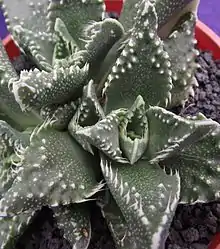 Crece en forma de roseta sobre un corto tallo de raíces carnosas. Cada roseta está compuesta por entre 6 u 8 hojas decusadas y gruesas, casi semicilíndricas en la zona basal tendiendo a convertirse en aquilladas hacia la mitad, son de forma romboidal o entre espatulada y algo alargada a lanceolada, en los márgenes poseen unos aguijones cartilaginosos muy curvados hacia el interior y frecuentemente con aristas.