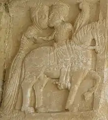 ![]() Favila representado despidiéndose de su esposa Froiluba en un relieve del s. XII (Monasterio de San Pedro de Villanueva, Cangas de Onís). | ||
