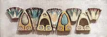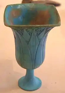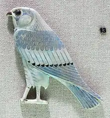 La loza ptolemaica y romana tiende a diferenciarse tipológica y tecnológicamente del material anterior: se caracteriza por el uso generalizado de la moldura y el alto relieve en las vasijas.[21] Un grupo de figuras de divinidades y halcones muy inusual y finamente realizadas en el Metropolitan Museum of Art de Nueva York, que aparentemente representan jeroglíficos que son elementos de una inscripción real, quizás de un santuario de madera, está decorado en forma de champlevé (típica técnica de esmalte sobre metal). Las depresiones del cuerpo de la loza se rellenaron con "pastas vítreas" coloreadas y se volvieron a pulir.[22]