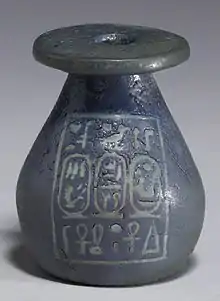 - Cesta Shawabti, ca. 1400-1390 a. C., 59.33, Museo de Brooklyn. Canasta de loza azul profundo para un shabti, inscrita con el nombre de la "Gran Esposa Real Ti'a", Reina de Amenhotep II