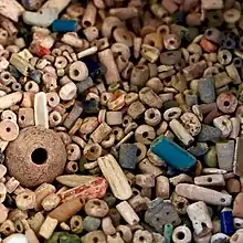 En el Reino Medio, las técnicas empleadas son el moldeado y la formación sobre un núcleo, a veces en conjunción con capas intermedias entre el esmalte y el cuerpo.[14] La loza marmolizada, resultante del trabajo de cuerpos de loza de diferentes colores juntos, para producir un cuerpo adherente uniforme, también aparece en este periodo.[12][14] Hacia el final del Reino Medio aparecen las técnicas de incisión, incrustación y resistencia, que se irán popularizando progresivamente hacia el Nuevo Reino.[14] En el Nuevo Reino se producen cuentas, amuletos y anillos para los dedos mediante una combinación de técnicas de modelado y moldeado.[14] En este periodo se crean detalles escultóricos utilizando incrustaciones de loza de diferentes colores o raspando el cuerpo para revelar la capa intermedia blanca en relieve. El moldeo se aplicó por primera vez a la fabricación de loza en el Reino Medio formando un modelo de un objeto, o empleando una pieza de loza terminada, imprimiéndola en arcilla húmeda, y más tarde cociendo la arcilla para crear un molde duradero.[10][19] La pasta de loza se podía presionar en el molde y, tras secarse, se trabajaba de nuevo mediante la abrasión de la superficie antes de la cocción.[10] Los moldes podían facilitar la producción en masa de objetos de loza como anillos de amuletos e incrustaciones, como lo demuestran los varios miles de pequeños moldes de arcilla de cara abierta excavados en Tell el Amarna.[13]