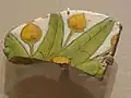 - Reconocimiento del vidriado por eflorescencia - Las piezas vidriadas por eflorescencia pueden mostrar rastros de marcas de soporte: el vidriado parece grueso y propenso a agrietarse, adelgazándose hacia el borde de la pieza y en zonas cóncavas.[27] En gran aumento el vidrio intersticial es extenso; las sales no reaccionadas que no han alcanzado la superficie se acumulan en el núcleo, creando puentes entre las partículas de cuarzo.[27]