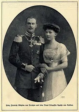![]() El príncipe Federico Guillermo (izquierda) junto a su mujer, la princesa Ágata (derecha) en su compromiso. | ||