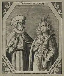 ![]() Grabado del siglo XVII representando a Felipa y su esposo, Robert de Vere. | ||