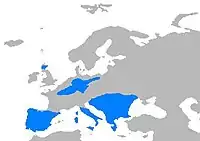 Las mayores poblaciones se hallan en la península ibérica, tanto en España como en Portugal, aunque no resulta abundante en Cataluña, Galicia, ni en la cornisa cantábrica. En la comunidad autónoma catalana se llevó a cabo un programa de cría en cautividad, con la finalidad de reintroducir a los ejemplares así criados en la naturaleza.
