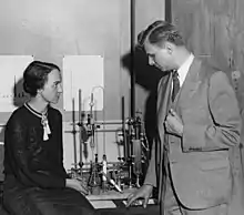 ![]() Ferdinand G. Brickwedde junto con su esposa, la física Marion Langhorne Howard Brickwedde (1909-1997). En el centro, un aparato para producir agua pesada. | ||