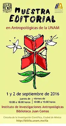 En el año 2016, no se pudo organizar la FLA como se acostumbraba, sin embargo la Biblioteca Juan Comas impulsó la realización de una muestra editorial, logrando cumplir su objetivo: acercar al personal académico del instituto a los materiales bibliográficos con la temática de la antropología y ciencias sociales para su selección y posterior adquisición, por parte de la Biblioteca (Fecha 1 y 2 de septiembre) | ![]() En 2016 la feria del libro antropológico no se llevó a cabo, sin embargo hubo una muestra editorial |