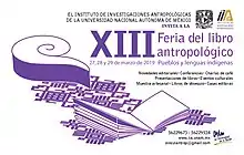 En el 2019 se organizó la XIII edición de la FLA, en esta ocasión se le dio una temática a la Feria "Pueblos y lenguas indígenas", del mismo modo al igual que sus anteriores ediciones se llevó a cabo un programa académico y cultural además de la venta de artesanías (Fecha 27 al 29 de marzo) | ![]() Cartel promocional de la octava Feria del Libro Antropológico de 2019 |